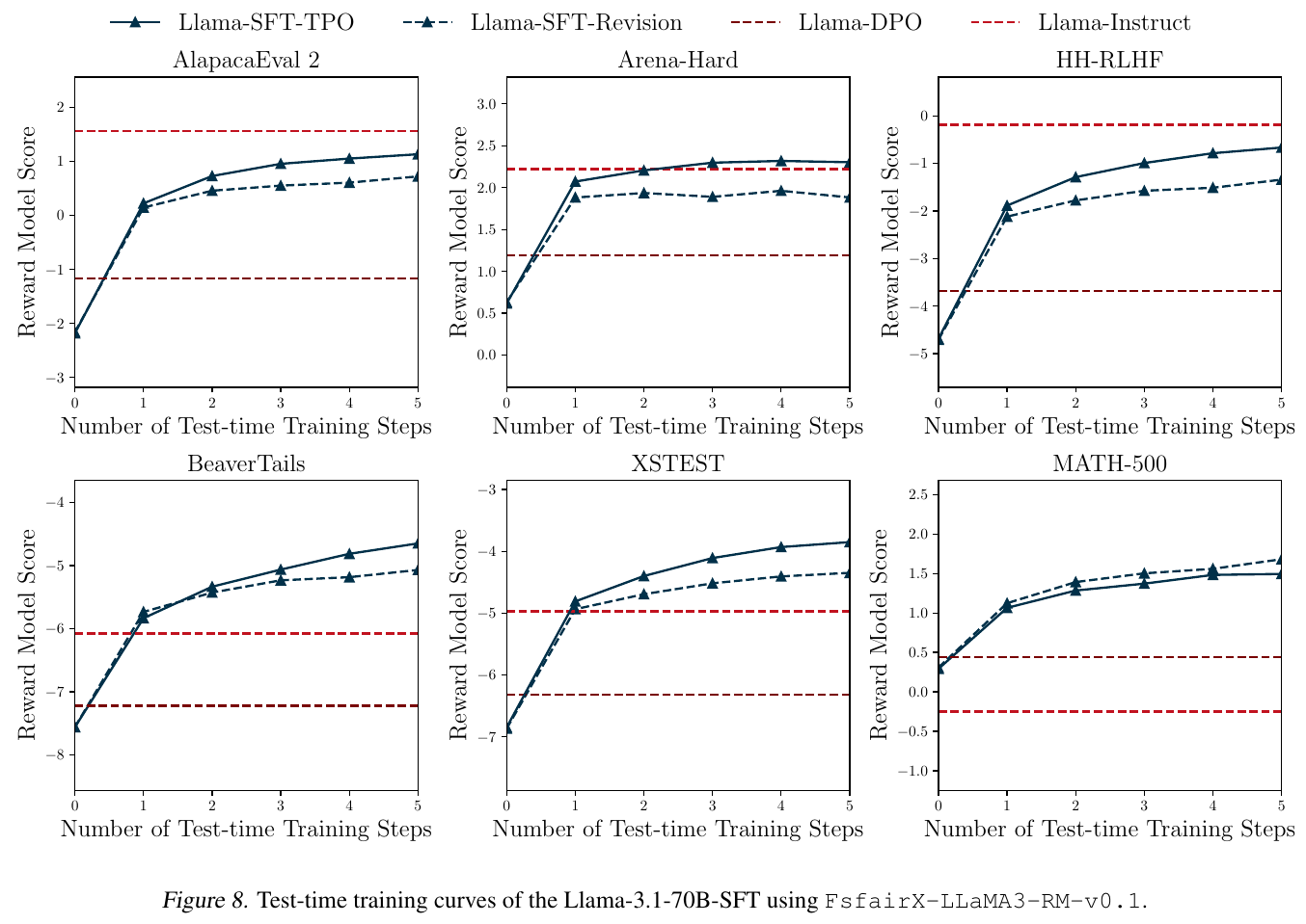 この図は、Llama-3.1-70B-SFTモデルにおける様々なベンチマークデータセットでのテスト時訓練曲線を示しています。Llama-SFT-TPOとLlama-SFT-Revisionという2つの方法が用いられています。横軸はテスト時のトレーニングステップの数を示し、縦軸は報酬モデルスコアを示しています。各グラフは異なるデータセットでのパフォーマンスを示しており、赤い破線はLlama-DPOとLlama-Instructの基準ラインを示しています。この図は、モデルが訓練ステップを経るごとに報酬モデルスコアが向上することで、人間の好みにより良く適合するようになっていく過程を示しています。