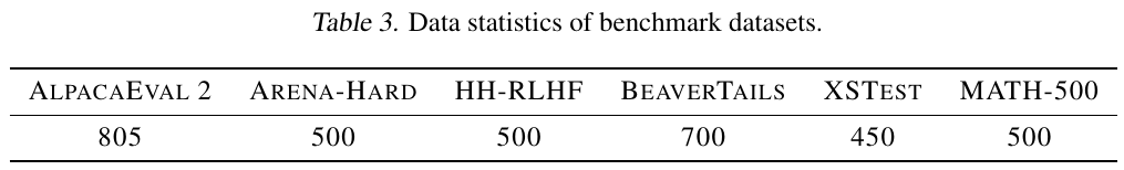 この表は、「Test-Time Preference Optimization: On-the-Fly Alignment via Iterative Textual Feedback」という論文から抽出されたデータセットの統計を示しています。具体的には、以下のベンチマークデータセットが掲載されています:AlpacaEval 2、Arena-Hard、HH-RLHF、BeaverTails、XSTest、MATH-500です。それぞれのデータセットには、テストに使用されたインスタンス数が示されています。最も多いのはAlpacaEval 2で805個、最も少ないのはXSTestで450個です。この情報は、これらのデータセットが実験や評価にどのように使われたかを把握する助けとなります。各データセットは、異なるタスクや評価基準に基づいています。