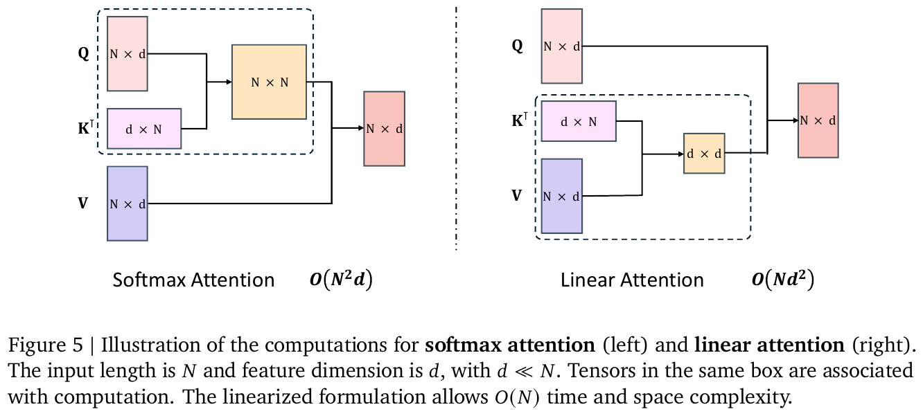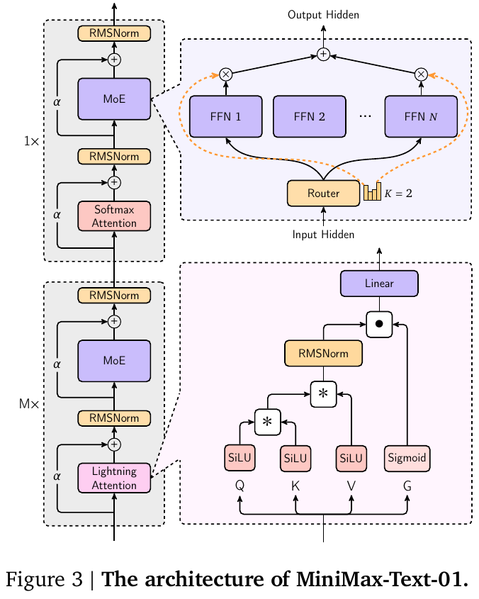 この図は、ソフトマックスアテンション(左)と線形アテンション(右)の計算を示しています。ソフトマックスアテンションは従来の方法で、入力長が \(N\) 、特徴次元が \(d\) です。計算複雑性は \(O(N^2d)\) となります。一方、線形アテンションは計算の効率化を図り、時間と空間の複雑性を \(O(Nd^2)\) に減少させています。 図の左側ではソフトマックスアテンションのプロセスが、右側では線形アテンションのプロセスが詳細に描かれており、計算効率に関する比較ができます。このように、線形アテンションは長いコンテクストを効率的に処理するために進化した手法であり、これにより膨大な数のトークンを効果的に扱うことが可能になるとされています。これは本論文で提案されているMiniMaxモデルが、多くのトークンを扱う能力を大幅に向上させている理由と一致します。