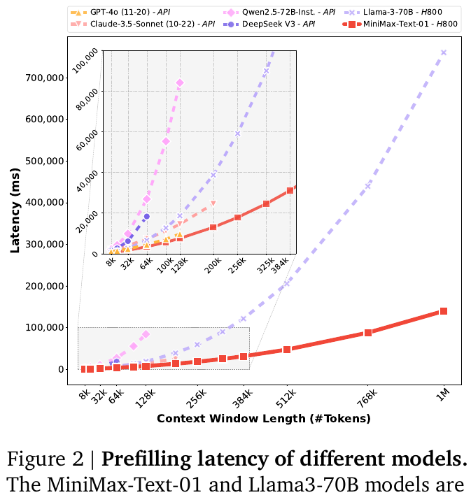 図2は、さまざまなモデルのコンテキストウィンドウ長に対するプリフィル処理の遅延を示しています。MiniMax-Text-01とLlama3-70Bの2つのモデルは、H800 GPU上でテストされ、他のモデルと比較されています。 主要なポイントは、MiniMax-Text-01が長大なコンテキストにおいて優れたパフォーマンスを示していることです。図では、コンテキストウィンドウの長さが増加するにつれて、遅延がどのように変化するかが示されており、特にMiniMax-Text-01が広い範囲で効率的な動作を保つことが分かります。これにより、長い文脈を扱う際の効果的な選択肢であることが強調されています。