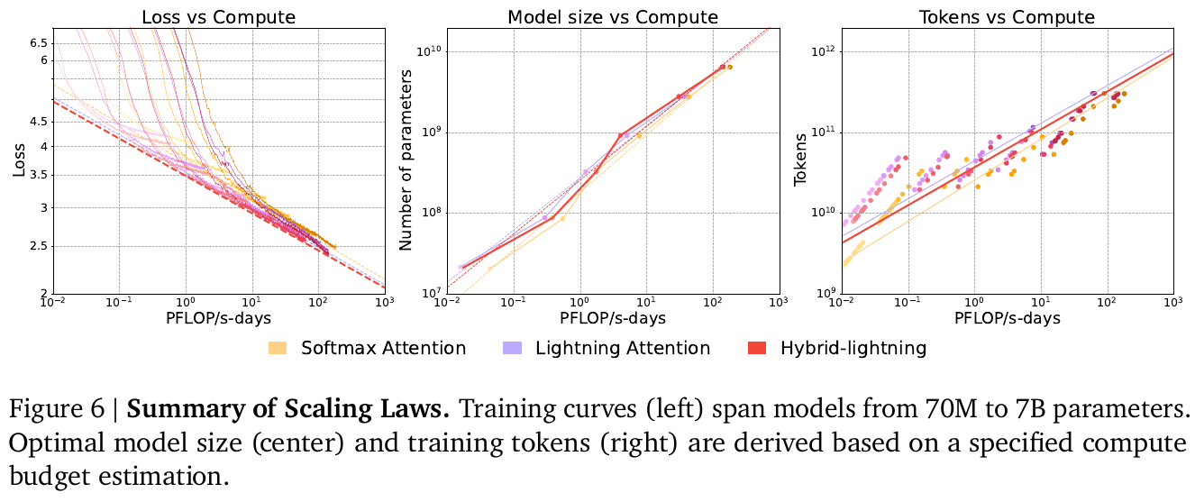 この図は、異なるモデルのトレーニング効率を視覚化しています。左のグラフは、計算リソースと損失の関係を示しており、計算量が増えると損失が減少する傾向があります。中央のグラフは、計算量に対するモデルの最適なサイズ(パラメータ数)を示しており、右のグラフは、計算量に対するトークン数の関係を示しています。 この記事の文脈では、モデルのサイズとトレーニングデータ量を計算予算に基づいて最適化する方法が強調されています。図は、ソフトマックスアテンション、ライトニングアテンション、ハイブリッドライトニングアテンションの3種の異なるアプローチを比較しており、ハイブリッドアプローチが他のアプローチより効率的であることが示唆されています。