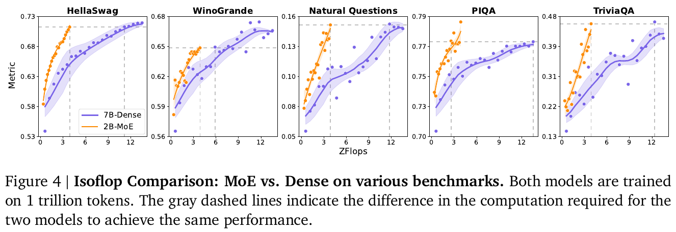 この図は、巨大な言語モデルの訓練における「Mixture of Experts (MoE)」モデルと「Dense」モデルの性能比較を示しています。具体的には、2B-MoEと7B-Denseの2つのモデルが、HellaSwag、WinoGrande、Natural Questions、PIQA、TriviaQAといった複数のベンチマークでの性能を示しています。 ここで、ZFlopsは計算量を示しており、グラフはこれに対する異なるモデルの性能(メトリック)を示しています。橙色の線はMoEモデル、青色の線はDenseモデルの結果を表します。各図では、MoEモデルが通常、少ない計算量でDenseモデルに匹敵するかそれ以上の性能を発揮していることが見て取れます。結果として、MoEアプローチは計算効率を維持しつつ高い性能を達成することを示しています。