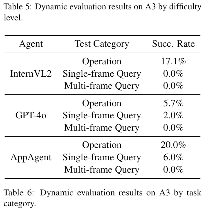 表5は、AIエージェントのA3プラットフォームにおける動的評価結果を示しています。これは、難易度別に操作、シングルフレームクエリ、マルチフレームクエリのカテゴリーで評価されています。InternVL2、GPT-4o、AppAgentの3つのエージェントが評価され、AppAgentが全体的に最も高い成功率を示していますが、特に操作タスクで強い傾向があります。一方で、マルチフレームクエリはどのエージェントでも成功率が低いことが確認できます。これは、現実の状況におけるマルチステップの過程を把握することの難しさを示しています。