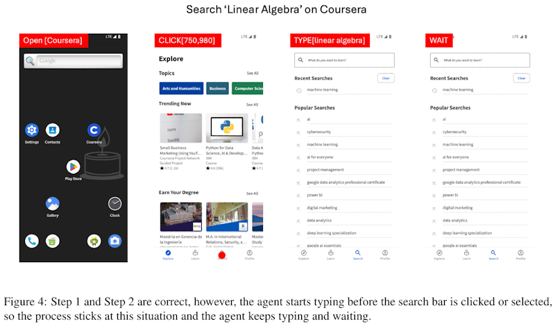 この図は、モバイルアプリ「Coursera」で「Linear Algebra」を検索する過程を示しています。最初のステップでは、アプリが正しく開かれ、ホーム画面が表示されます。その後、検索バーにアクセスせずに検索用語を打ち始めます。この結果、予期したプロセスが進まなくなり、AIエージェントが入力し続けたり、待機し続けたりする状況が生まれてしまいます。これは、ユーザーインターフェース(UI)操作の自律性を評価する試みの一部です。