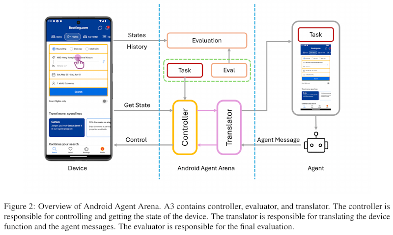 画像は、Android Agent Arena (A3)の概要を示しています。A3は、モバイルデバイス上でタスクを自動的に実行するためのプラットフォームで、コントローラー、トランスレーター、エバリュエーターの3つのコンポーネントで構成されています。コントローラーがデバイスの状態を取得し、トランスレーターがそれをエージェントメッセージに変換します。エバリュエーターは、タスクが正しく完了したかどうかを評価する役割を担っています。このシステムは、リアルワールドのシナリオに基づいて、さまざまなアプリケーションから多様なタスクを評価することが可能です。