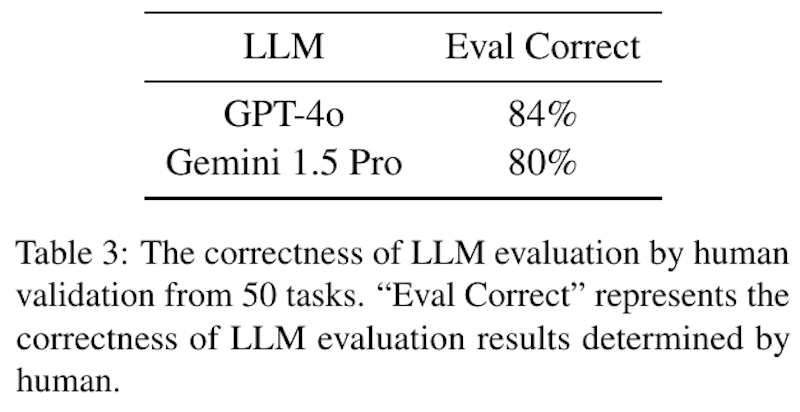 この図は、「GPT-4o」と「Gemini 1.5 Pro」という2つの大規模言語モデル(LLM)の評価結果を示しています。表には、これらのモデルが全体の50のタスクで正しく評価できた割合が示されています。具体的には、GPT-4oが84%、Gemini 1.5 Proが80%の正答率を持っています。この結果は人間による評価で確認されており、LLMがどの程度正確にタスクを評価できるかを示しています。
