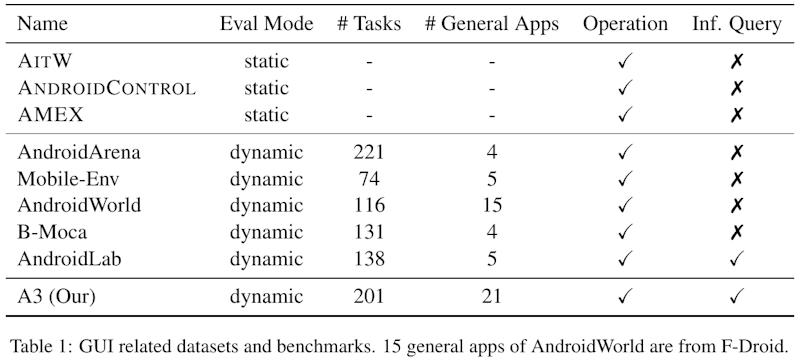 この画像は、Android GUI エージェントに関連するデータセットとベンチマークを示しています。表は、評価モードやタスク数、一般アプリ数など、各データセットの特徴を比較しています。静的評価とは異なり、ほとんどのデータセットは動的評価を採用しており、操作や問合せが可能なことが示されています。A3は、特に実世界のタスクに対応できるように設計されており、21のアプリと201のタスクを提供しています。