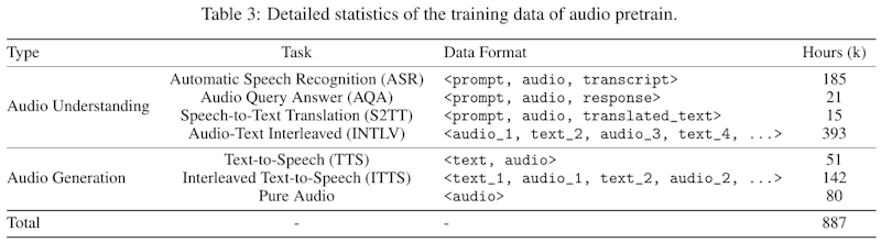 本論文では音声に関する学習データを大きく「音声理解」と「音声生成」に分けて用いている。表では各作業が示す内容やデータ形式、そして総学習時間が示されている。たとえば音声認識(ASR)や音声質問応答(AQA)などは、音声とテキストの対を使って言語理解を高める目的で実施され、翻訳や発話内容の書き起こし、音声とテキストの交互提示など多彩な形式が含まれる。また音声生成は音声合成(TTS)やテキストと音声が交互に続く形式、純粋な音声のみで構成されるデータなども取り入れている。こうして合計約887時間分の音声関連データを使い、モデルが幅広い音声処理能力を獲得できるように設計されている。