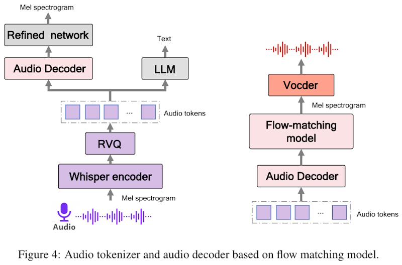 図中では、まずマイクからの音声がメルスペクトログラムに変換され、Whisperベースのエンコーダで特徴を抽出し、RVQ(Residual Vector Quantization)によって離散的なオーディオトークンが生成される。これらのトークンは言語モデル(LLM)にも入力され、テキストとの対応づけを学習する。一方、そのオーディオトークンをもとにメルスペクトログラムを再構成するため、対称構造のオーディオデコーダが用いられる。さらに、フローマッチング方式のデコーダを追加で用いることで音質を高め、最終的にHiFi-GANボコーダにより波形を生成し、自然な音声再生を実現している点が示されている。