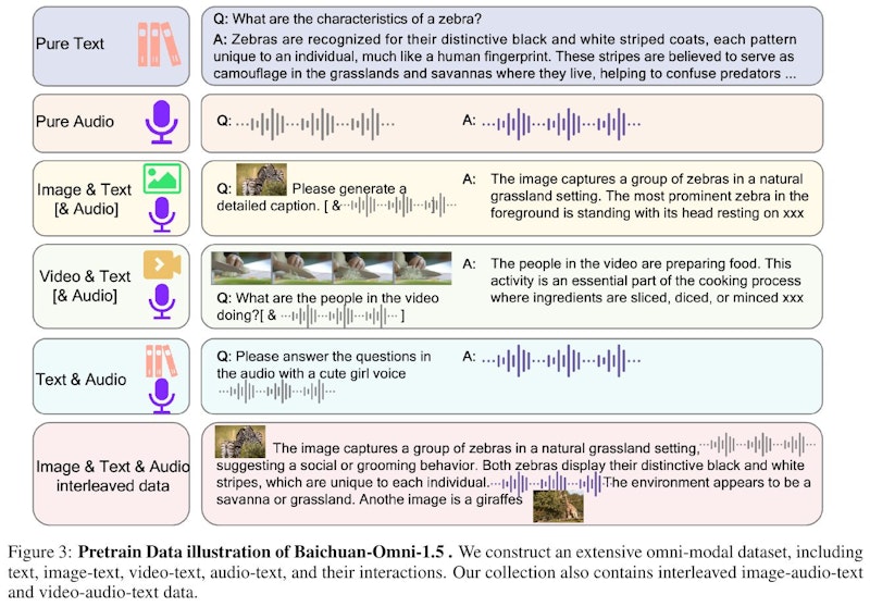 図中では、Baichuan-Omni-1.5の事前学習で使用される多彩なデータ形式を例示しています。純粋なテキストや音声だけでなく、画像・テキストの組み合わせ、さらに動画・テキストや音声・テキストなどが示され、実際の学習ではこれらが相互に組み合わされています。それぞれの吹き出しでは「画像とそれに対応する質問」「音声の問いかけと応答」「動画の内容理解」などが対話形式で表現され、モデルが幅広いモードのデータを統合的に処理できることを強調しているのです。これにより、テキストだけでなく多様なメディア情報を取り込んだ総合的な理解や生成が可能になることを示しています。