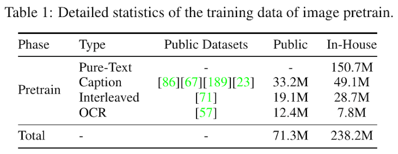 この表は、Baichuan-Omni-1.5の画像事前学習で使われたデータの内訳と規模を示している。表の列「Public」には公開リソースから得られたデータ数が、「In-House」には独自で収集あるいは生成したデータ数が示されている。たとえばPure-Textはすべて独自データから成り、CaptionやInterleaved、OCRといった複数の種類がそれぞれ公開データと独自データを組み合わせて利用されている。最終行の合計欄から、画像まわりの大規模データが幅広い手法で集約されていることがわかる。