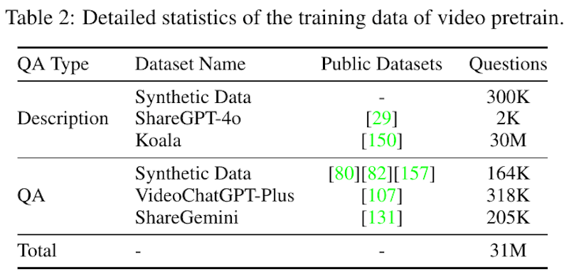 この表はBaichuan-Omni-1.5の動画事前学習で使われたデータ統計をまとめている。Descriptionの欄には動画内容の説明に用いるデータセットが並び、Synthetic DataやShareGPT-4oなどから約30Mもの質問が含まれている。QAの欄は動画上での質問応答を扱い、VideoChatGPT-PlusやShareGeminiなどを合わせて最終的に31M規模のデータがそろう点が特徴である。こうした幅広い動画キャプションとQAデータを組み合わせることで、多様な動画理解能力を強化する土台となっている。