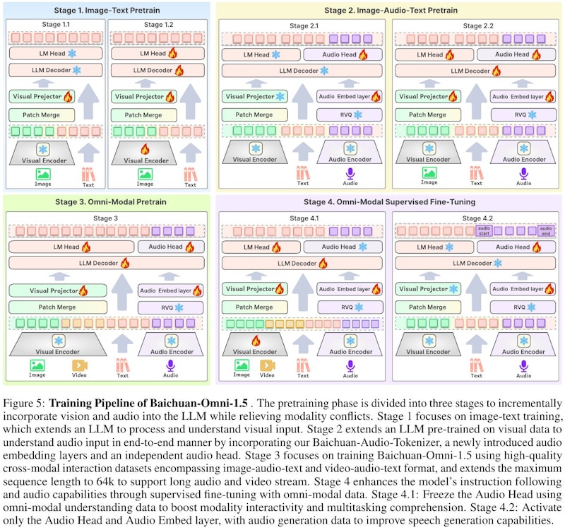 Baichuan-Omni-1.5は、画像と音声、そしてテキストを処理するために統合的なアーキテクチャを用いたモデルとして提案されている。視覚情報を扱うVisual Branchと音声情報を扱うAudio Branch、そしてテキストを処理するLLMを結びつけることで、多様な入力形式から学習しやすくしている。入力データは大規模に収集され、画像・音声・テキストという三つの要素が重なり合う状況でも対応可能なように加工と品質管理が施されている。これらのデータをもとに段階的な事前学習プロセスが組まれており、それぞれのモーダル単独での学習から、最終的に複数モーダルを同時に扱う段階に至るよう設計されている。同モデルは、まず画像と言語の組み合わせを学習し、次のステップで音声を含む複数のモーダルへ拡張し、最終的に三つのモーダルすべてを包含した最適なパラメータを獲得する流れをとっている。