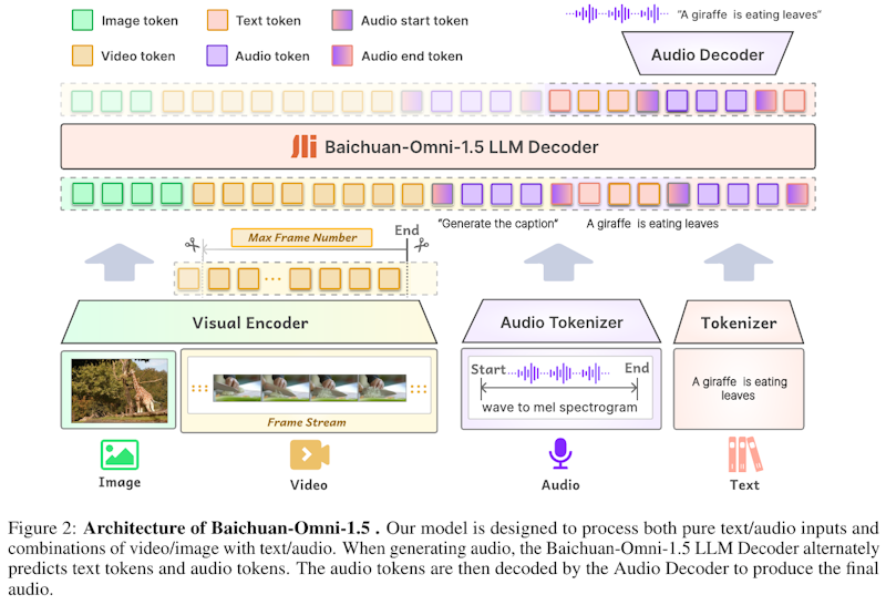 図ではBaichuan-Omni-1.5が、画像や動画を取り込むVisual Encoderと、音声をトークン化するAudio Tokenizer、そしてそれらを統合して推論するLLM Decoderを備えている様子が示されている。画像や動画はフレーム単位で符号化され、LLM Decoderに送られた後、テキストトークンと組み合わされて意味を理解する仕組みだ。音声はAudio Tokenizerによって変換され、LLM Decoder内でテキストと交互に予測される。最終的に生成された音声トークンはAudio Decoderで再度音声化され、テキストと音声の両方を出力できるようになっている。