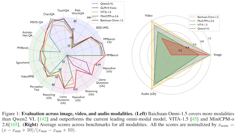 左のレーダーチャートは、各モデルが画像や動画、音声などの多様なベンチマークでどれだけ高い性能を示すかを一目で比較している。たとえばTextVQAやActivity-Net-QAなど、視覚と言語や聴覚情報の統合能力が問われるタスクが含まれる。Baichuan-Omni-1.5は他のモデルより扱えるモダリティが幅広く、スコアも高水準に達している。右の三角形グラフは画像、動画、音声タスクの平均的な評価を示し、それぞれのモデルが総合的にどの程度バランスよく優れているかを可視化している。