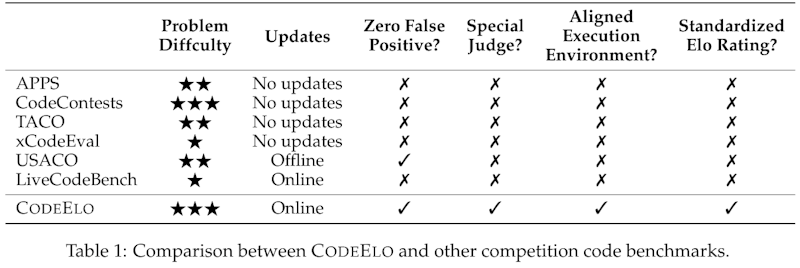 画像の表は、CODEELOというベンチマークと他の競技プログラム用ベンチマークを比較したものです。表では、問題の難易度から更新頻度、誤判定の有無、特別なジャッジのサポート、実行環境の整合性、標準化されたEloレーティングの有無を評価しています。CODEELOはオンラインで更新され、ゼロ誤判定と特別なジャッジをサポートし、整合性のある実行環境と標準化されたEloレーティングを提供します。これは、CODEELOが他のベンチマークに比べて、より競技レベルのコード生成能力を効果的に評価できることを示しています。
