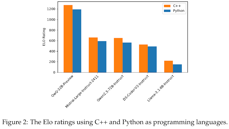 この図は、C++とPythonを用いたプログラミング言語でのEloレーティングを比較したものです。図には異なるモデルのEloレーティングが示されており、オレンジがC++、青がPythonを表しています。各モデルについて、C++のほうがPythonよりも高いEloレーティングを示しており、特にQwQ-32B-Previewモデルではその差が顕著です。これは、競技プログラミングにおける実行効率がC++でより達成しやすいため、現行のベンチマークでPythonのみを用いると正確な評価を得られない場合があることを示しています。この結果から、モデルがC++を選択することが効率面で有利であることが示唆されます。