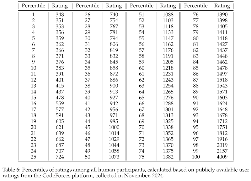 この表は、CodeForcesプラットフォームの参加者の評価をパーセンタイルにしたものを示しています。各評価は、特定の参加者グループ内での相対的な位置を示しており、上位のパーセンタイルに位置するほど高い能力を持つことを意味します。評価は2024年11月に収集されたデータに基づいています。 例えば、パーセンタイル1に位置する参加者の評価は348で、これはその評価が全体の1%の参加者よりも上だということを示しています。逆に、評価4009はトップの1%(パーセンタイル100)に位置します。これにより、参加者のプログラミングスキルを比較したり、特定のモデルが人間の参加者とどの程度競えるかを評価する基準になります。 このデータは、研究でのモデルの能力評価に使われ、人間の競技プログラマーとの比較を可能にします。