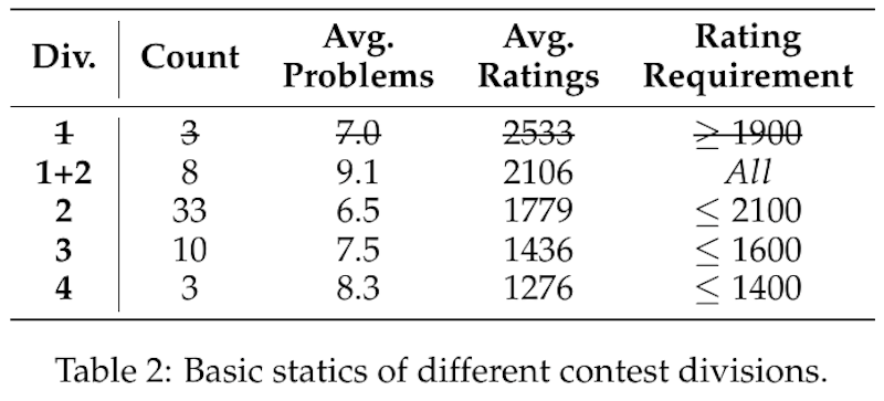 この表は、異なるコンテスト部門の基本的な統計情報を示しています。「Div.」は部門で、「Count」はコンテストの数、「Avg. Problems」は平均問題数、「Avg. Ratings」は平均レーティング、「Rating Requirement」は参加者に必要なレーティングを示しています。例えば、Div. 1の平均レーティングは2533で、参加者は1900以上のレーティングが必要です。Div. 2は平均レーティング1779で、参加資格は2100以下です。このように、部門ごとの難易度と参加条件が明確化されています。