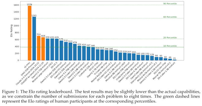 この図は、CODEELOというベンチマークに基づくモデルのEloレーティングランキングを示しています。Eloレーティングは、競技プログラミングの能力を評価するための指標で、人間の参加者とモデルを比較する際に用いられます。オレンジのバーはトップ2のモデルで、他の青いバーは残りのモデルを示します。緑色の点線は、10パーセンタイルから90パーセンタイルまでの人間参加者のEloレーティングを示しており、これらの線とモデルのレーティングを比較することで、モデルの性能を人間と相対的に評価できます。上位モデルは1578や1261などの高レーティングを持ち、他の多くのモデルは比較的低い位置にあります。