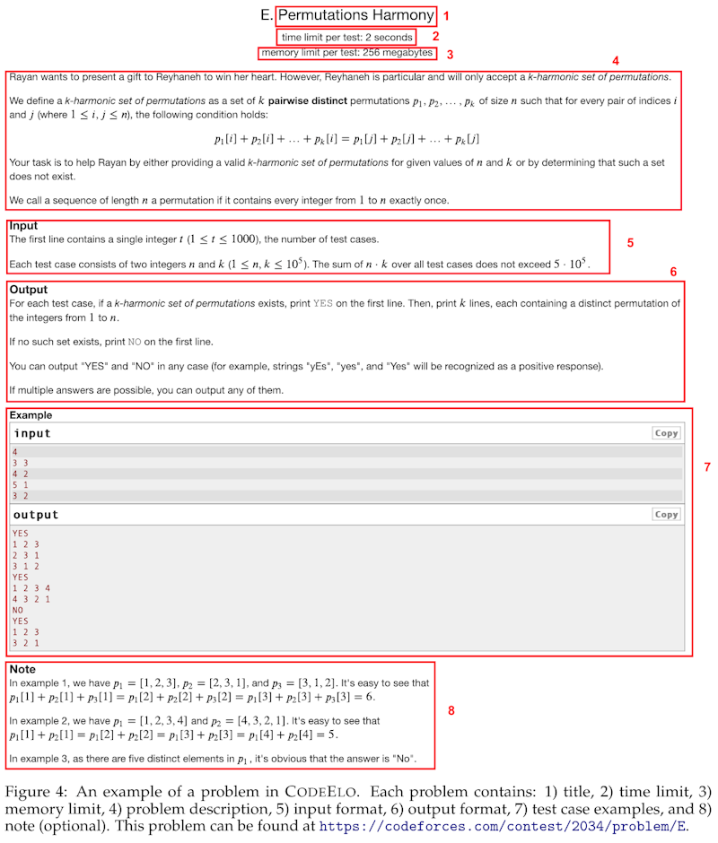 この画像は、CODEELOのコードコンペティション問題の例を示しています。タイトルは「Permutations Harmony」で、与えられたnとkに対して「k-harmonic」な順列集合を探す問題です。 最初の部分には、そのテストに関する時間制限(2秒)とメモリ制限(256MB)が記されています。問題の説明では、n個の数字とk個の順列に関する条件が述べられ、その中で条件を満たす順列が存在するかを判定することが課題とされています。 入力フォーマットではテストケースの数、各テストケースにおけるnとkが与えられ、出力フォーマットでは条件を満たす場合にはYESと順列を、満たさない場合にはNOを出力することが要求されます。 例として、4つのテストケースの入力とその出力例が示されており、最後には例に関する注釈があり、具体的な順列とその和がどのように計算されるかが説明されています。これにより、問題の要件を具体的に理解しやすくしています。