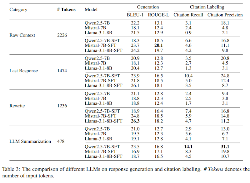 次に、応答生成と引用ラベリングのタスクでは、会話履歴の圧縮方法による影響を調査しました。生の文脈、最後の応答のみ、質問の書き換え、LLMによる要約の4つの方法を比較した結果、入力を短くしても応答の質は維持され、むしろ引用の精度は向上することが分かりました。
