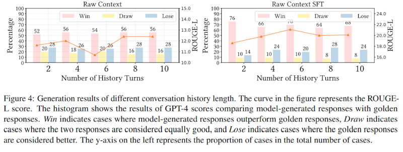 また、会話履歴の長さを変えた実験では、6ターン程度までは性能が向上し、それ以上では低下することが示されました。