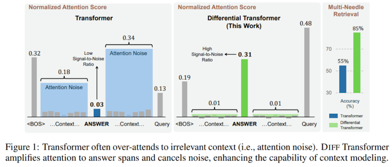 従来のTransformerは、入力された文章の中で本当に重要な情報とそうでない情報を適切に区別できず、結果として正確な情報抽出や要約生成などのタスクで性能が低下していました。この問題を解決するために、研究チームは「Differential Transformer」という新しいアーキテクチャを開発しました。