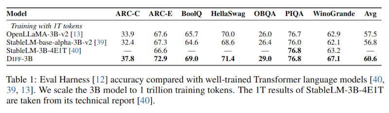 まず、言語モデリングの評価実験では、3Bパラメータのモデルを1兆トークンで学習し、既存のTransformerベースのモデルと比較しました。その結果、提案手法は従来手法を上回る性能を示しています。