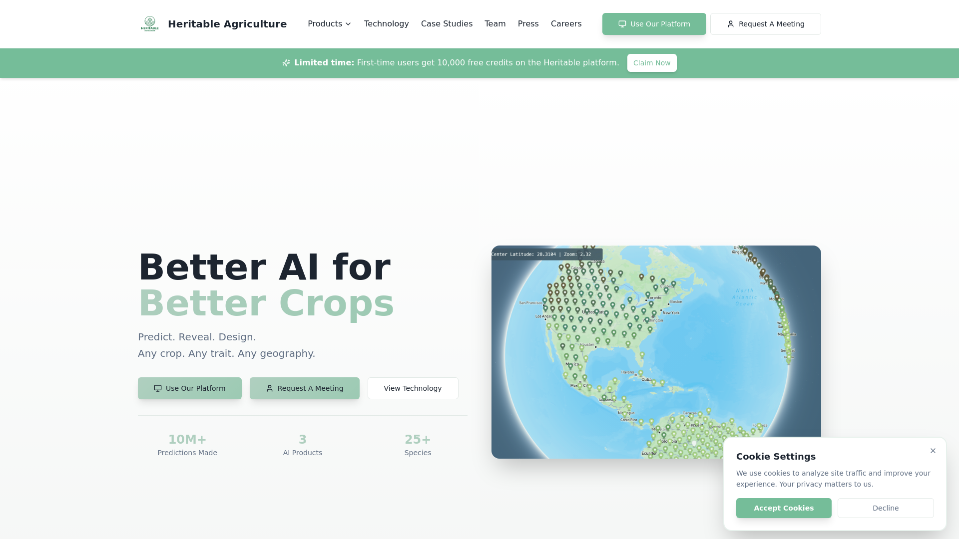 現代の農業は人類が利用可能な土地の約半分を占め、温室効果ガス排出量の4分の1、地下水の70%を消費しています。これを改善すべく、Heritable Agricultureは高度な計算生物学と機械学習技術を応用して、植物のゲノムとその機能を特定し、最適な環境での農作物生産を実現する方法を研究。