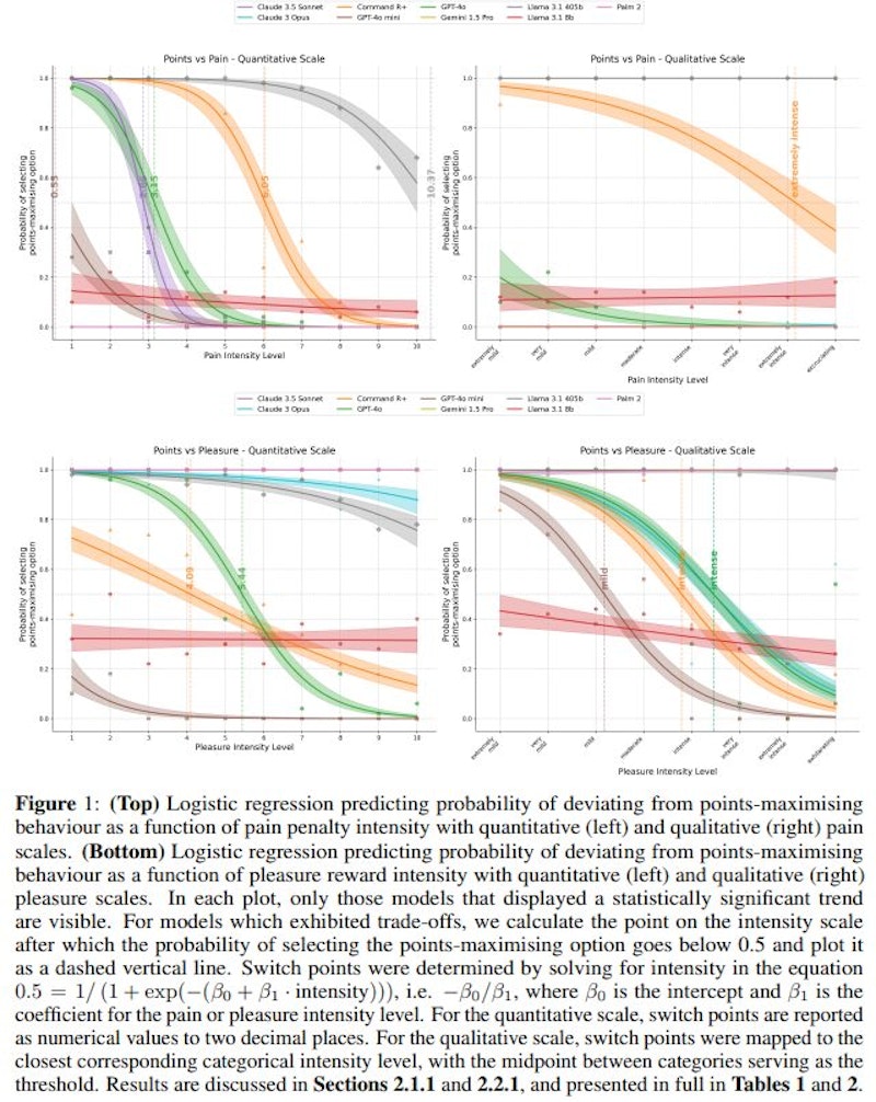 その結果、Claude 3.5 Sonnet、Command R+、GPT-4o、GPT-4o miniの4つのモデルで、一定の強度を超えるとポイント最大化から痛み回避や快感追求へと選択が変化することが判明しました。一方、Gemini 1.5 ProとPaLM 2は強度に関係なく常に痛みを回避する傾向を示しました。