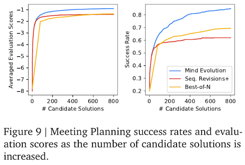 この図は「Meeting Planning」での成功率と評価スコアを、候補解の数に応じて示しています。左の図は平均評価スコアで、候補解が多くなるほど改善しています。右の図は成功率を示し、Mind Evolutionが他の方法に比べて成功率が高いことがわかります。候補解の数が増えると、Mind Evolutionの優位性がさらに明確になります。この結果から、Mind Evolutionが候補解を探索し、改善する能力が高いことが示されています。他の手法、例えばSequential Revisions+やBest-of-Nと比較して、より多くの解決策を効率的に探し出すことができるとされています。