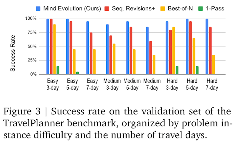 図3は、問題の難易度と旅行日数に基づいたTravelPlannerベンチマークの成功率を示しています。この図からわかるように、研究で提案された手法「Mind Evolution」は、他の3つの戦略よりも一貫して高い成功率を達成しています。「Mind Evolution」は、最も難しい条件下でも、ほぼすべての場合で最も高い成功率を示しています。他のアルゴリズムと比べて、特にHard 7-dayの場合の成功率が際立って高く、進化的検索戦略の有効性を示しています。このことから、「Mind Evolution」は問題の複雑さや日数が増加するときでも、他の手法に比べて優れたパフォーマンスを発揮することがわかります。
