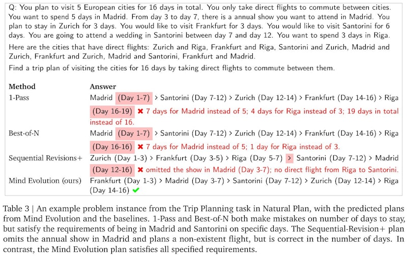 この画像は、16日間で5つのヨーロッパの都市を訪れる旅行計画の例です。各方法が生成した回答が表されており、特定の日に都市にいる必要があるという条件が示されています。 1-PassとBest-of-Nの方法は、指定された日数を守れず、マドリッドとサントリーニには特定の日に訪れる必要がありますが、要件を完全には満たせていません。Sequential Revisions+では年次イベントを見逃し、存在しないフライトを計画しています。これに対し、Mind Evolutionの計画は全ての要件を満たした正確な解決策を提供しています。 この結果は、Mind Evolutionが他の手法に比べて効果的に問題を解決する能力があることを示しています。