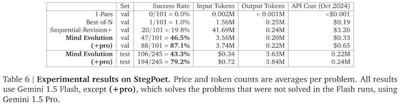 表6は、StegPoetにおける実験結果を示しています。この表では、異なる推論手法の成功率、トークン数、APIコストを比較しています。さまざまな手法における成功率の違いが示され、特にMind Evolution法が目立って高い成果を示しています。Gemini 1.5 Flashをベースにした結果が通常使用され、未解決の問題をMind EvolutionによるGemini 1.5 Proで解決すると、さらに成功率が向上します。この方法により、より高い問題解決能力が証明され、追加の計算資源を利用することで成果を大幅に改善できることが、この表を通じて明らかにされています。
