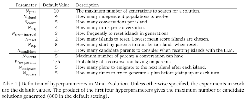 この画像は、Mind Evolutionという進化的探索戦略におけるハイパーパラメータを示しています。この研究では、大規模言語モデル(LLM)を使用して、解答候補を生成し、再結合し、改善する方法を説明しています。表には、各ハイパーパラメータのデフォルト値とその説明が記載されています。たとえば、`Ngens`はソリューションを探索するための最大世代数を示し、`Nisland`は進化させる独立した集団の数を示します。これらの値を調整することで、より効率的な探索が可能になり、Mind Evolutionは計算リソースを効率的に活用し、問題解決能力を向上させます。このアプローチは他の戦略に比べて、自然言語計画タスクにおいて高い成功率を示しています。