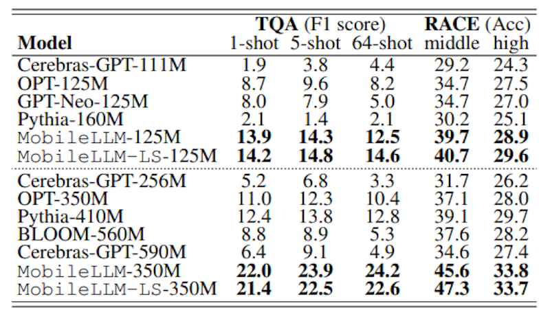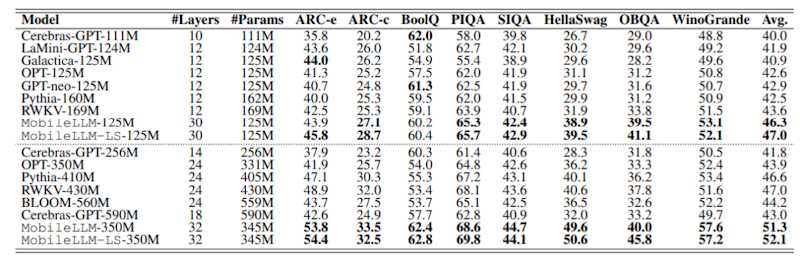 まず、MobileLLMは125Mおよび350Mパラメータのサイズで実験され、従来のモデルと比較して高い精度を示しました。特に、MobileLLMは、他の同規模のモデル(例えば、OPT-125MやGPT-Neo-125M)に対しても大幅な精度向上を実現しました。
