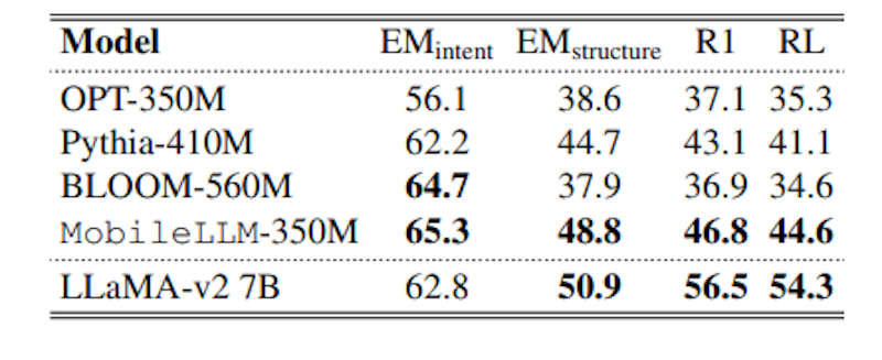次に、API呼び出しやチャットといった具体的なオンデバイスの応用においても評価が行われました。MobileLLM-350Mは、7Bパラメータを持つ大規模モデルLLaMA-v2と比較しても、非常に近い精度でAPIの呼び出しを正確に行うことができることが示されています。