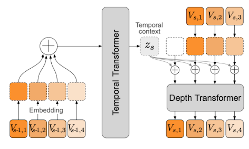 Moshiはこれらの問題を解決するために、ユーザーの音声とMoshi自身の音声を同時に処理できるように設計されています。そうすることで、話者のターンを明確に分ける必要がなく、重複する発話や割り込みといった自然な会話の動態をそのまま扱うことができます。