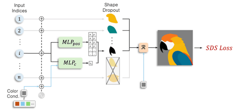 これに対応する形で開発されたNeuralSVGは、Score Distillation Sampling(SDS)技術を使用して図形に重み付けを行い、ドロップアウトベースの手法でレイヤー構造を重視することを実現しています。この設計により、簡潔な図形数でも全体の構造を正確に捉えられる画像を生成可能にしました。