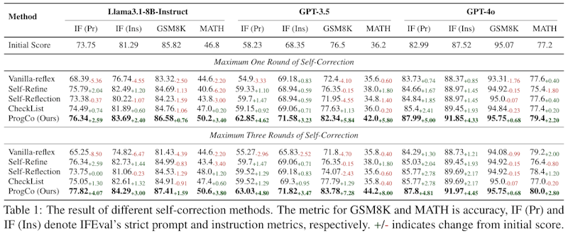 この表は、論文で提案されている様々な自己修正方法の効果を示しています。Llama3.1、GPT-3.5、GPT-4oといった異なる大型言語モデルを使用し、それぞれの方法が、初期スコアに対してどれだけ改善を見せたかが記載されています。ProgCoという方法が最も高い改善スコアを示しており、一度の自己修正で他の手法よりも優れた成果を上げています。これは特に数学や推論などの複雑なタスクで効果的であることが示されています。