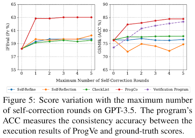 図5は、GPT-3.5を用いた自己修正ラウンドの回数によるスコア変動を示しています。プログラムのACCは、ProgVeの実行結果と正解の一貫性精度を計測します。左の図はIFEvalデータセットの結果で、自己修正ラウンドが増すごとにスコアが徐々に改善している様子が示されています。右の図でもGSM8Kでの自己修正によって一貫したスコアの向上が見られ、ProgCoの効果が強調されています。スコアの上昇は、複雑な推論が求められるタスクでも有効性を示しています。