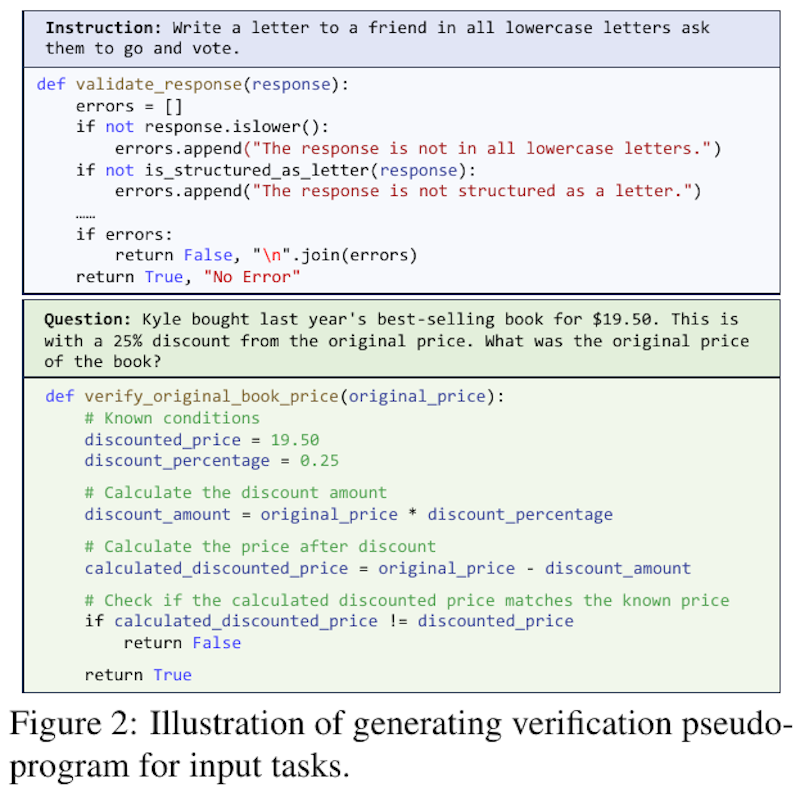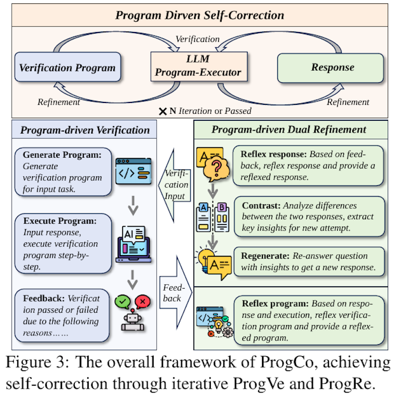 この画像は、プログラムによる自己修正の仕組みを示しています。図2では、「自己検証」(ProgVe)と「自己改良」(ProgRe)の擬似プログラム生成法が視覚化されています。具体的には、例として示されている2つのタスクに対して、入力された指示や問題に基づいて検証プログラムを自動生成し、それに基づいて言語モデルが自動的に解を確認する手順を示しています。この方法により、複雑な論理や計算問題をより正確に検証できるようにし、自己修正を効果的に行うことができます。