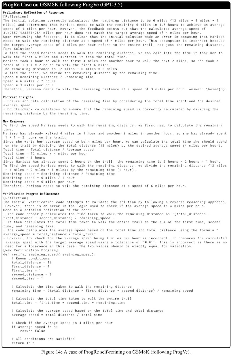 この画像は、GPT-3.5を用いた自己修正のケースを示しています。問題は、12マイルのトレイルをハイキングしているマリッサが、平均速度4マイル/時を達成するために、残りの距離をどの速度で歩く必要があるかを求めるものです。最初の解決策は、誤った計算に基づいていましたが、反省と再検討を経て、正しい速度を見つけました。画像は、数学的推論を改善し、自己修正を成功させる手順を具体的に示しています。