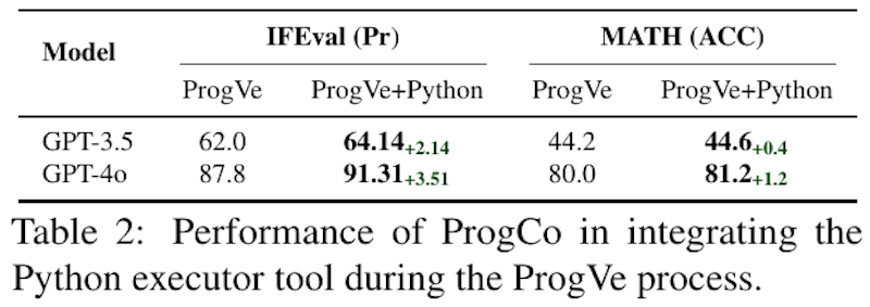 表は、プログラム駆動の自己修正技術「ProgCo」がPythonの実行ツールを組み込んだ結果を示しています。GPT-3.5とGPT-4oのモデルで実施され、「IFEval」では最大3.51%、「MATH」では最大1.2%の性能向上が見られます。この結果は、Python実行ツールの利用が自己修正能力を高め、特にプログラムベースの検証において効果的であることを示しています。