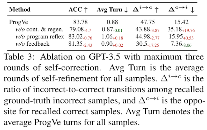 この表は、GPT-3.5モデルにおける自己修正機能のアブレーション結果を示しています。表中の「ProgVe」は、プログラム駆動の検証法を指し、自己修正を通じて検出されたサンプルの正確性を向上させるものです。「ACC」は正確性、「Avg Turn」は平均自己修正回数、「Δ i→c」は誤りから正解への変化率、「Δ c→i」はその逆を示しています。「w/o cont. & regen.」などの行では特定の要素を取り除いた場合の性能が示され、自己修正がどのように影響を受けるかが示されています。正確性の向上と誤りの減少がProgVeの効果として確認されています。