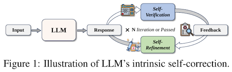図1は、大規模言語モデル(LLM)の自己修正プロセスを示しています。まず、入力がLLMに与えられ、初期応答が生成されます。その後、自身で応答内容を検証する「自己検証」と、応答を改善する「自己改良」の2つの段階があります。この過程で、必要に応じて何度か反復が行われ、最終的に検証が成功するか、最大反復回数に達すると終了します。この仕組みにより、外部フィードバックなしでも、LLMが自身の誤りを修正できるように設計されています。