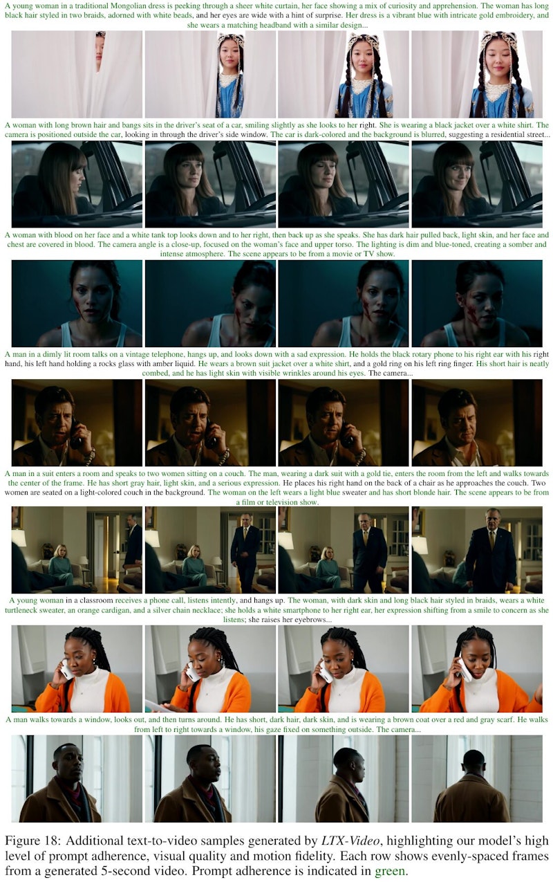 この画像は、LTX-Videoを用いたテキストから動画生成のサンプルを示しています。各行は生成された5秒の動画のフレームを等間隔で並べたものです。これにより、モデルの命令に対する高い忠実度、視覚品質、そして動きの再現性が強調されています。各ケースは、多様なシナリオにおけるモデルの性能を示す例です。緑の文字はプロンプトの一部として提供された説明です。