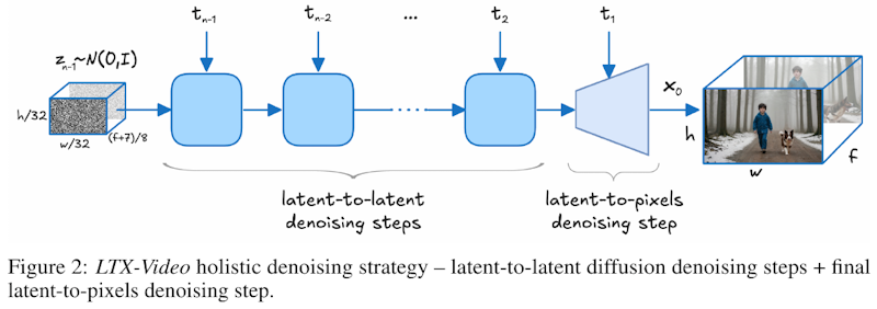 この図は、LTX-Videoの全体的な除去ノイズ戦略を示しています。まず、ランダムノイズから始まり、潜在空間内でノイズ除去を段階的に行う「潜在対潜在」のステップが続きます。その後、「潜在対ピクセル」の最終ステップで潜在空間からピクセル空間への変換を行い、クリーンな結果を得ます。この方法により、詳細を保持しつつ効率的に高品質の映像を生成することが可能です。