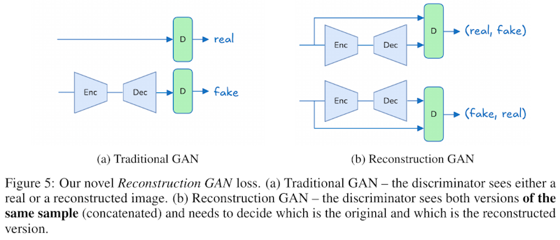 これは図5で、「Reconstruction GAN」に関する説明です。図(a)では、従来のGANが確実に本物か再構築された画像かを識別する方法を示しています。図(b)では「Reconstruction GAN」が示され、ここでディスクリミネーターは、同じサンプルの2つのバージョン(本物と再構築版)を同時に見て、それらを判別する必要があります。この手法は、再構築品質を向上させるための工夫です。